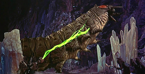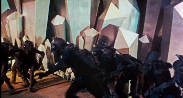 The Selenites were an advanced race of intelligent ant-like people from the 1964 retro science fiction film First Men on the Moon. The Selenites had a different society than humans, where they didn't make war, however they put employees or other Selenite workers under a form of suspended animation when they were no longer of use. Selentites inhabited catacomb like tunnels beneath the moon's surface, where they were free from the moon's meteor showers, and where they generated their power from the sun, using gaps from the surface. Because the Selenites' world rotated around the Earth, they showed